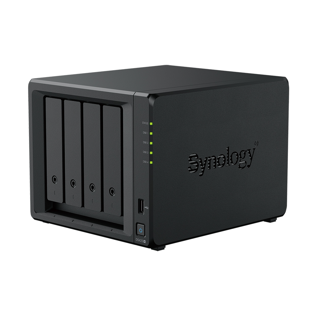 Urządzenie oferuje 4 zatoki na dyski 3.5″/2.5″ SATA oraz 2 sloty M.2 NVMe, które pozwalają na przyspieszenie pracy cache SSD. DS425+ wspiera różne konfiguracje RAID, w tym Synology Hybrid RAID, RAID 0, 1, 5, 6, 10 i JBOD, co umożliwia dostosowanie systemu do potrzeb użytkownika – od maksymalnej wydajności po najwyższy poziom ochrony danych.