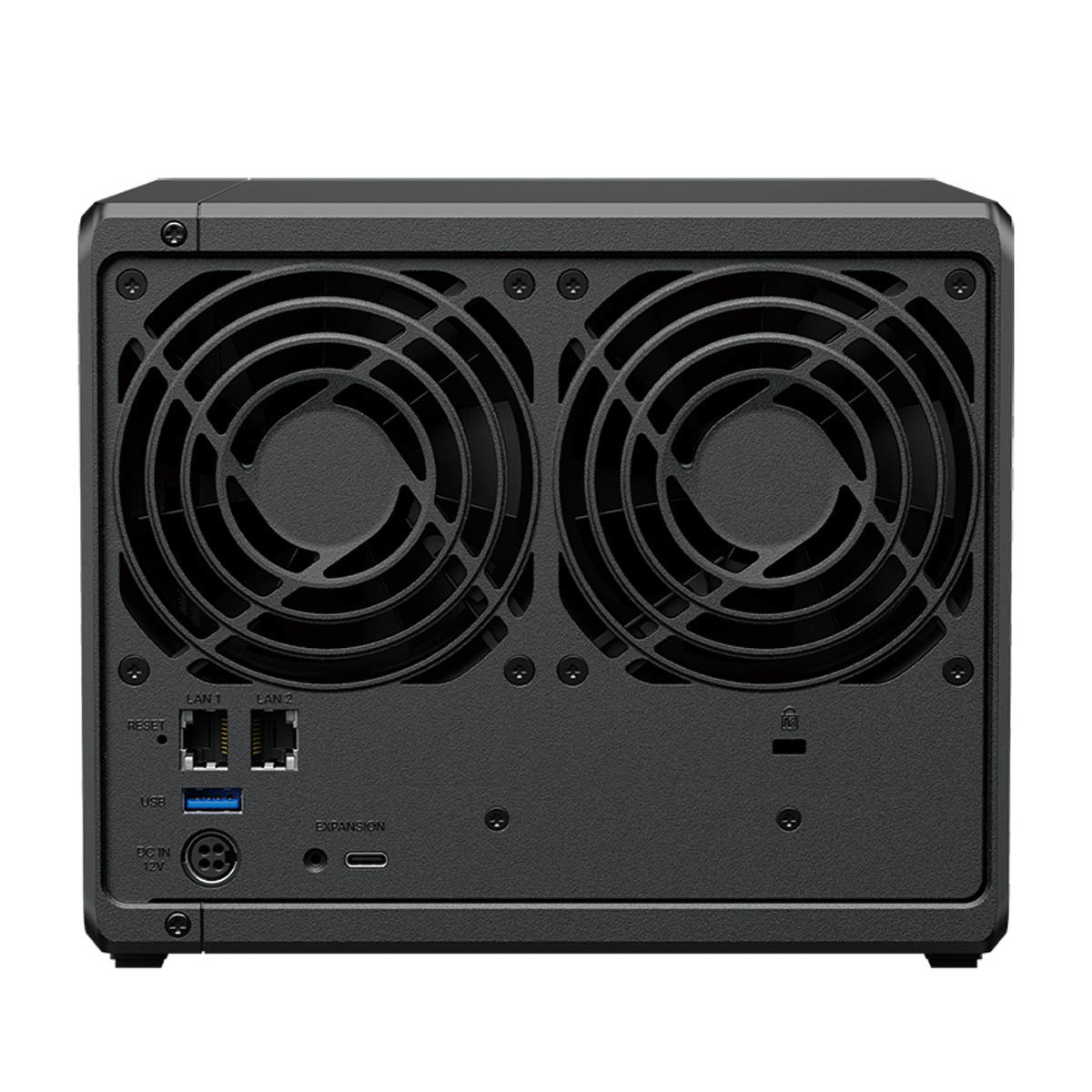 Urządzenie posiada 4 kieszenie na dyski SATA oraz możliwość rozbudowy do 9 zatok z DX525. Dodatkowe dwa sloty M.2 umożliwiają włączenie cache SSD bez zajmowania głównych zatok.