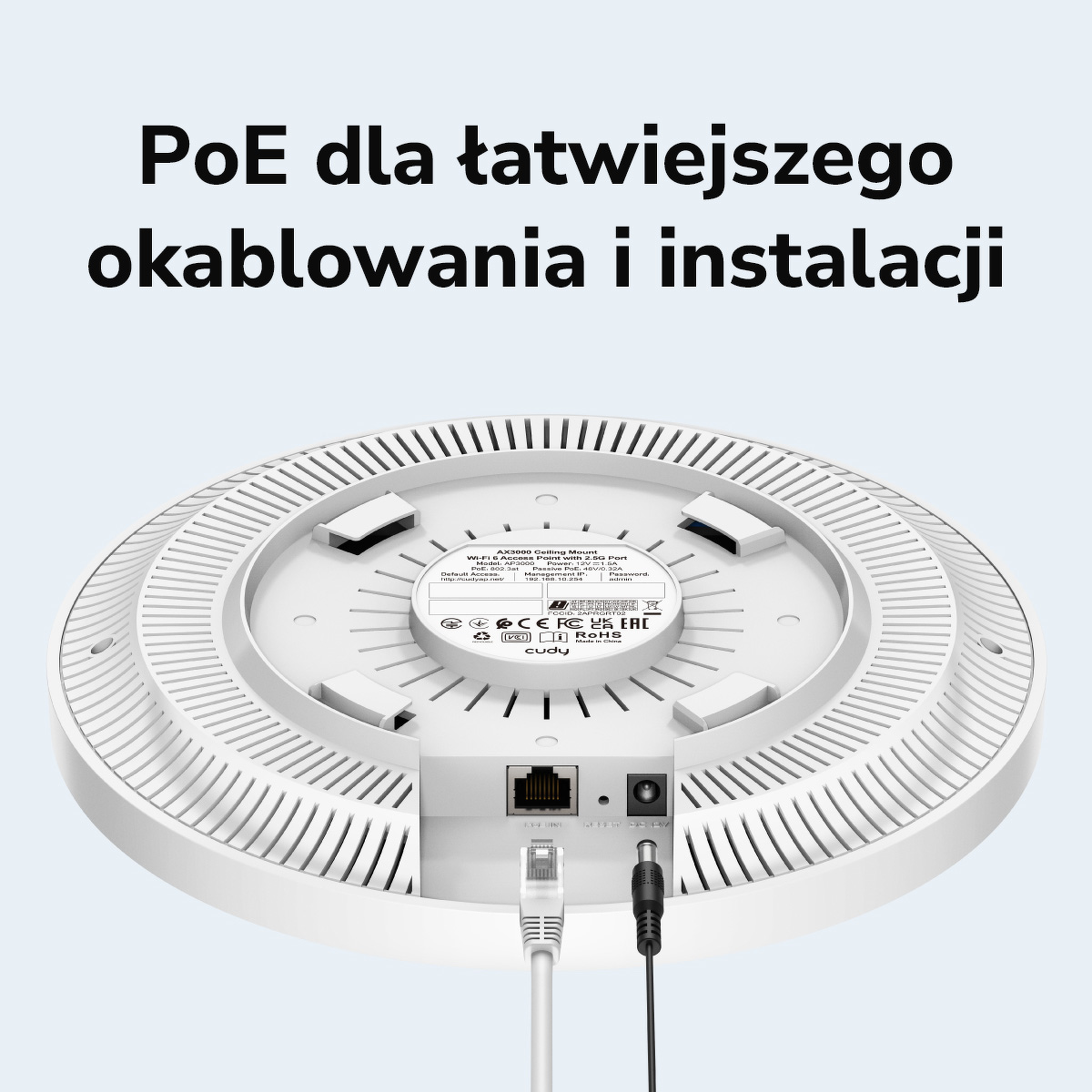 Dzięki wsparciu dla technologii tradycyjny zasilacz 12 V DC, Cudy AP3000 oferuje pełną elastyczność w instalacji i zasilaniu. To oznacza łatwiejsze wdrożenie, niezależnie od lokalizacji, oraz możliwość montażu w najbardziej dogodnym miejscu – czy to na ścianie, czy na suficie.