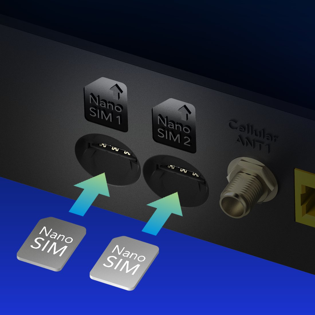 - Rodzaje wejść/wyjść: RJ-45 10/100/1000 (LAN) – 3 szt.; RJ-45 10/100/1000 (LAN/WAN) – 1 szt.; gniazdo kart nano SIM – 2 szt.; złącze zasilania – 1 szt.