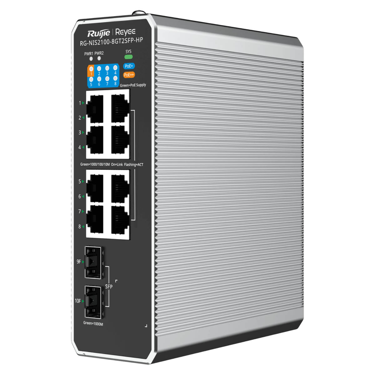 RG-NIS2100-8GT2SFP-HP, 10-portowy przełącznik przemysłowy zarządzany w chmurze, z 1 portem PoE++, 7 portami PoE+ i 2 portami SFP.