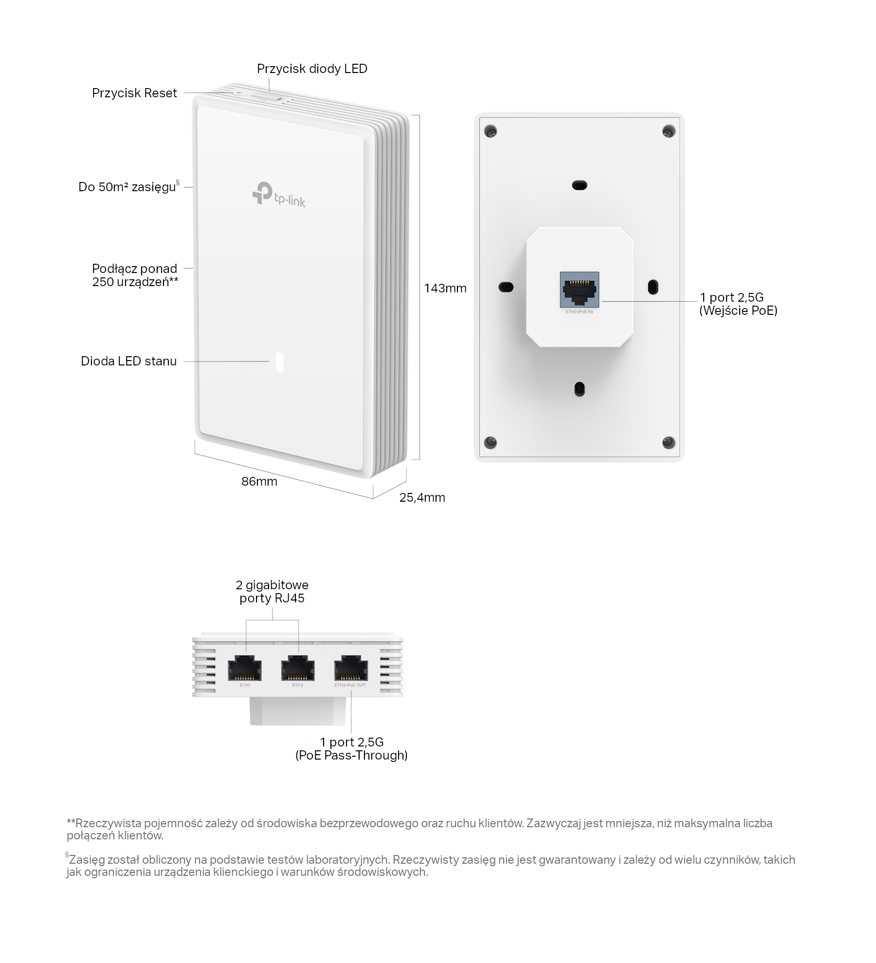 | Porty | • Uplink: 1 port Ethernet 2,5G • Downlink: (Port 2,5G obsługuje PoE Pass-Through. Funkcja PoE Pass-Through wymaga użycia zasilania PoE na wejściu 802.3at/bt. Jeśli zużycie energii urządzenia downstream Punktu dostępowego przekracza 7W, Punkt dostępowy będzie wymagał wtedy na wejściu zasilania PoE 802.3bt.) |