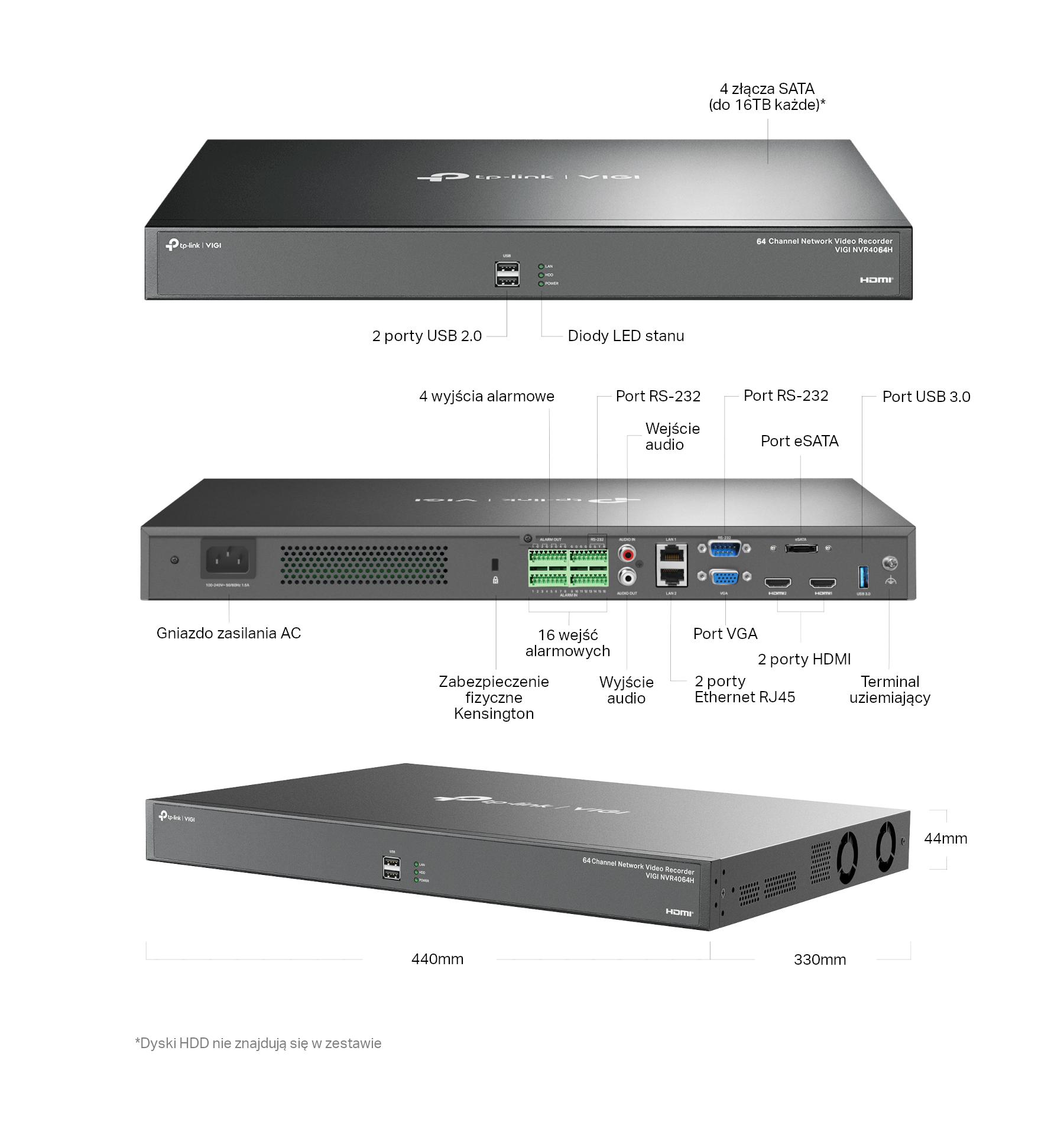 | Zawartość opakowania | • Rejestrator VIGI NVR4064H • Mysz • Instrukcja instalacji • Kabel zasilający • Kable zasilające dyski HDD • Kable danych dysków HDD • Złącze Wejść/Wyjść • Uchwyty montażowe • Śruby • Gumowe nóżki • Śruby do dysków HDD |