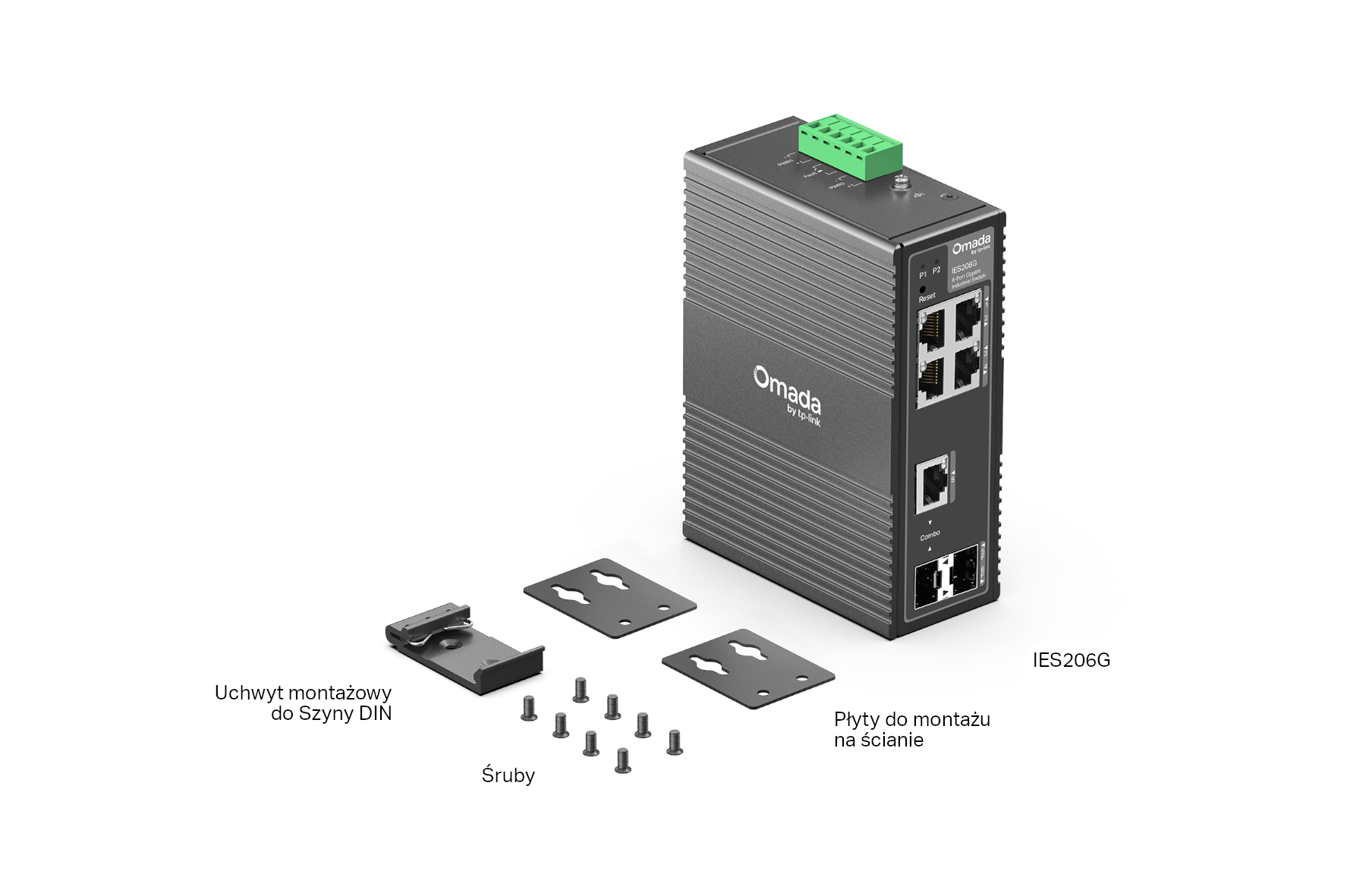 Zawartość opakowania | • IES206G • Uchwyt montażowy do Szyny DIN • Płyty do montażu na ścianie • Instrukcja instalacji |